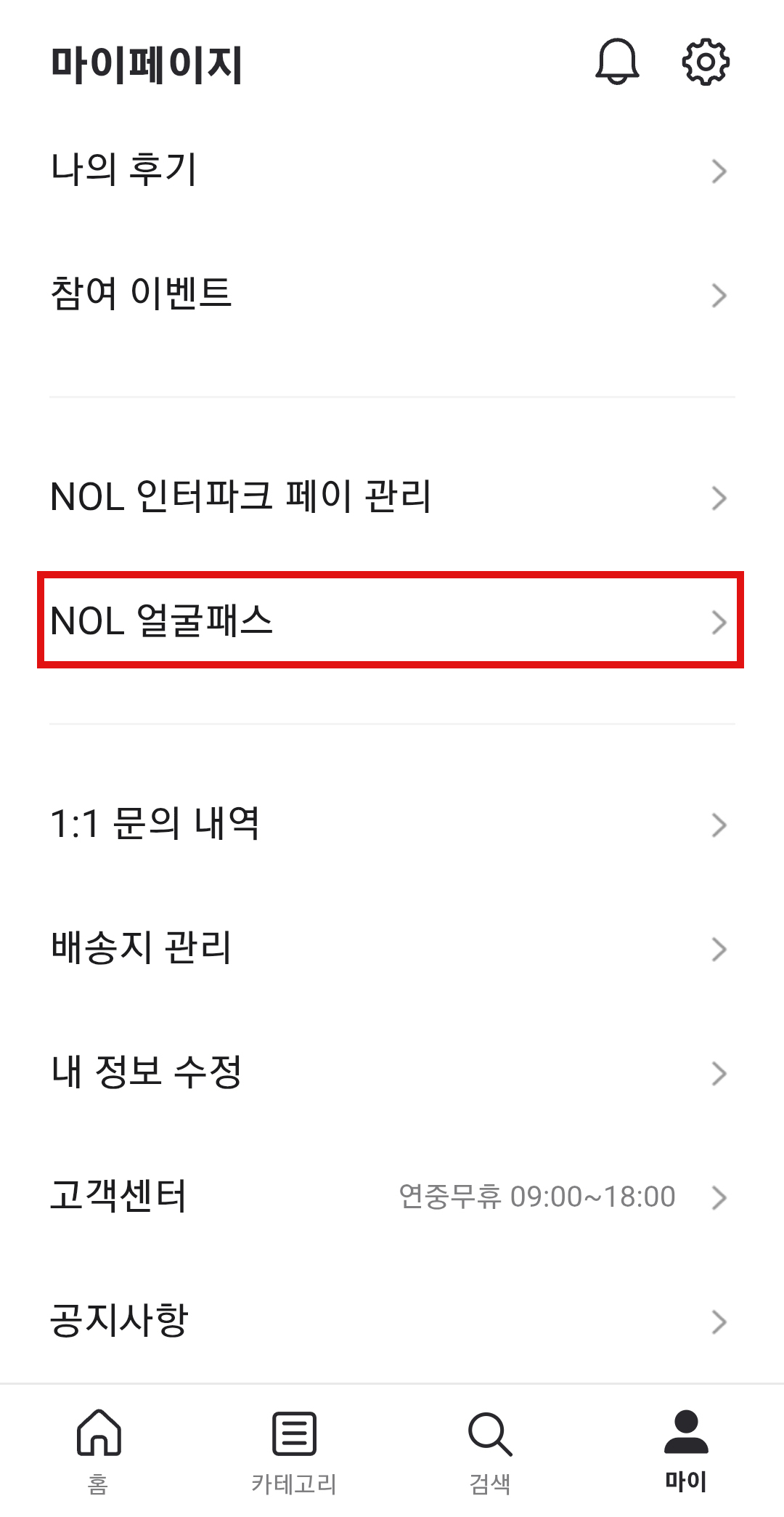 NOL 앱-마이페이지-NOL 얼굴패스 클릭-안내에 따라 좌,우,정면 얼굴을 등록합니다.